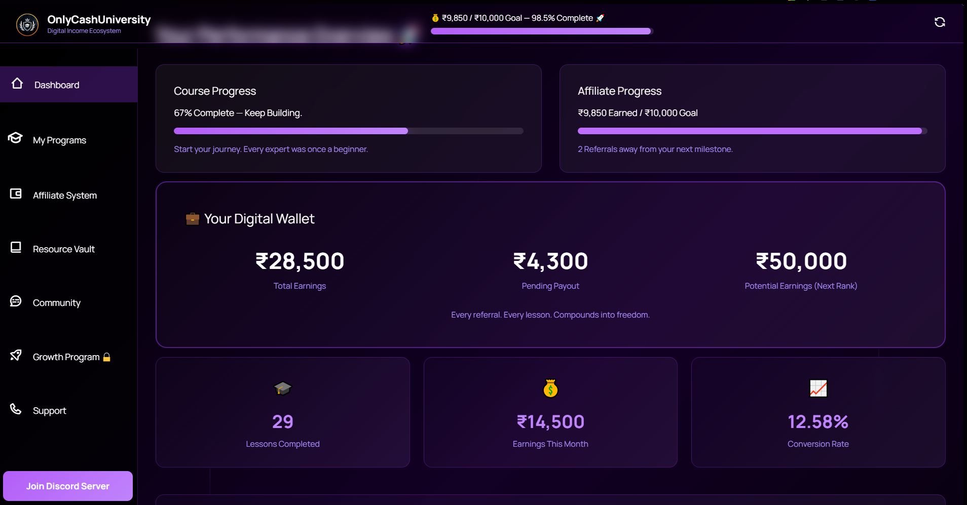 Inside OnlyCashUniversity, you'll master 9+ modern wealth-creation models β Designed to teach you online Income skills, not just collect certificates.